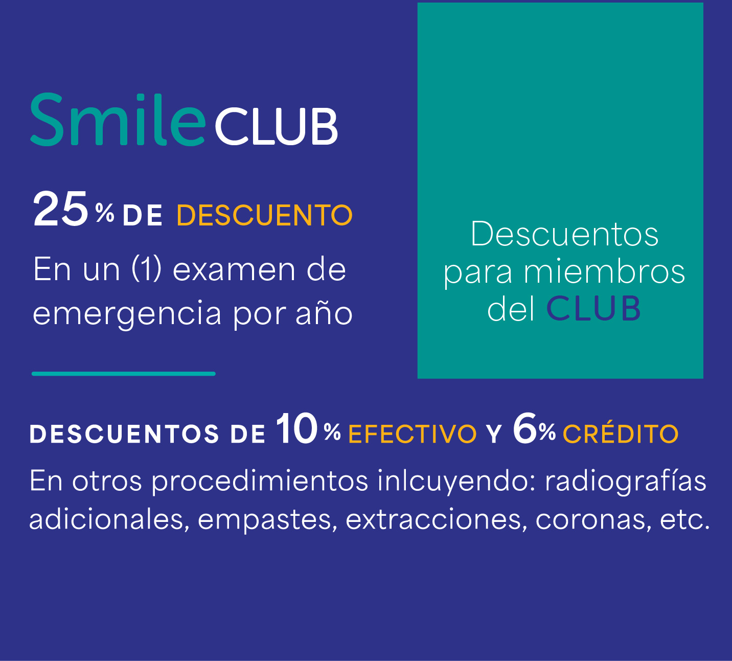 El Club de Sonrisas de Carolina Smiles Dentistry es un plan dental con descuento que se paga una vez al año. Le ayuda a ahorrar dinero en sus limpiezas, exámenes y radiografías.